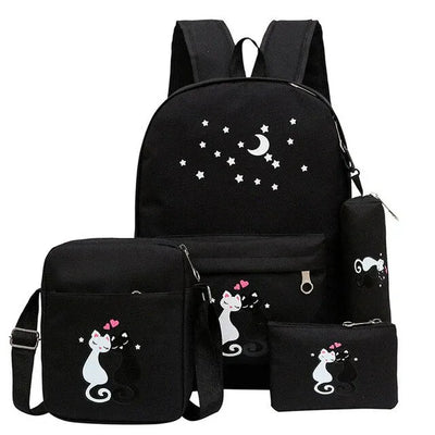 Trendy 4 in 1 Cat Bag Set – Canvas Backpack for Girls